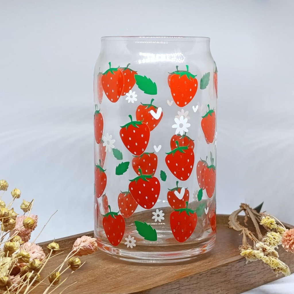 Sklenice s vinylovým polepem - motiv jahody.